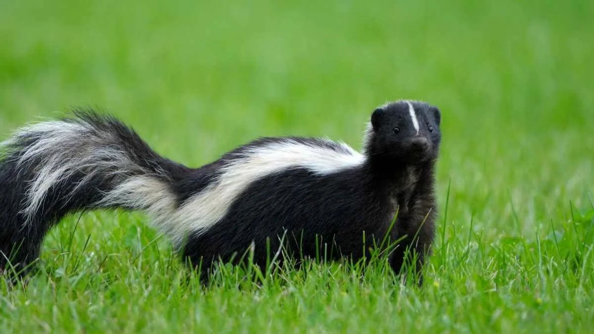 The striped skunk (Mephitis mephitis) is a medium-sized nocturnal mammal recognized by its bold black-and-white coloration—typically a white stripe or pair of stripes running from the head down the back—and its powerful defensive spray, which can accurately project a foul-smelling musk up to 10–15 feet when threatened. Omnivorous and opportunistic, striped skunks feed on insects, small rodents, fruits, eggs, and carrion, making them common in rural, suburban, and even urban environments where they take advantage of gardens, trash, and animal burrows. They are generally solitary outside of the breeding season, denning in hollow logs, brush piles, or beneath porches, and can be beneficial for controlling insect and rodent populations, though they can transmit rabies and may dig in lawns while foraging for grubs. Skunks typically have 4–10 kits per litter born in spring, and their slow, deliberate movements and warning behaviors—stamping, hissing, and tail-raising—often precede spraying, giving people and pets a chance to avoid confrontation.